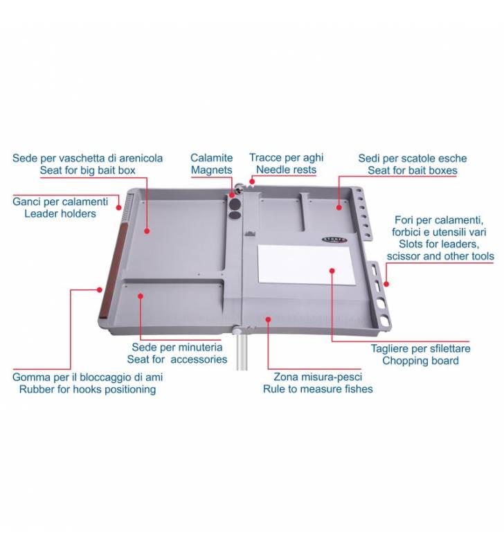 Foldable and light design to meet the multiple needs of the fisherman. Its structure is highly resistant plastic material is perfectly rounded and has no sharp corners. The niches with which it is equipped can contain various bait trays in a perfectly stable position. Other important features make this folding bait tray a real complete workbench.