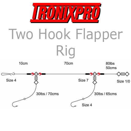 Two hook rigs also allow the angler to fish two different baits when hunting for a variety of species. Our two hook rigs are available either as a flapper or as a clipped down version for distance casting. The clipped down version comes with a rig spring below the top hook snood to eliminate hook length stretch and to keep snoods tight.